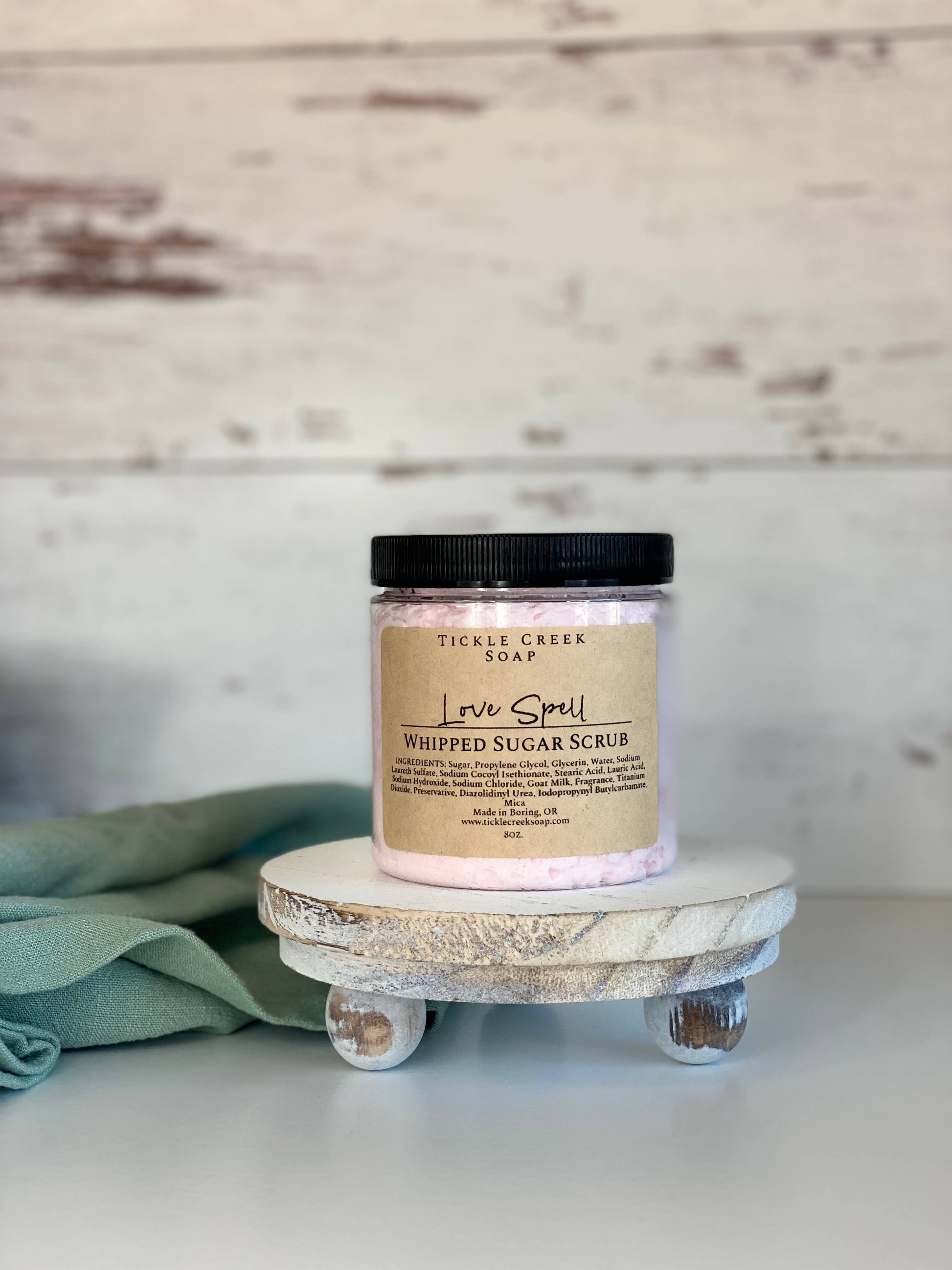 This sugar scrubs scent is a sophisticated, feminine blend of peach and apple blossom atop smooth coconut milk, jasmine and hydrangea blossoms. Completed with a base of light vanilla, white musk and powder. This fragrance was inspired by the Victoria’s Secret® scent. This whipped sugar scrub soap in Love Spell will exfoliate, cleanse, and moisturize all at the same time!