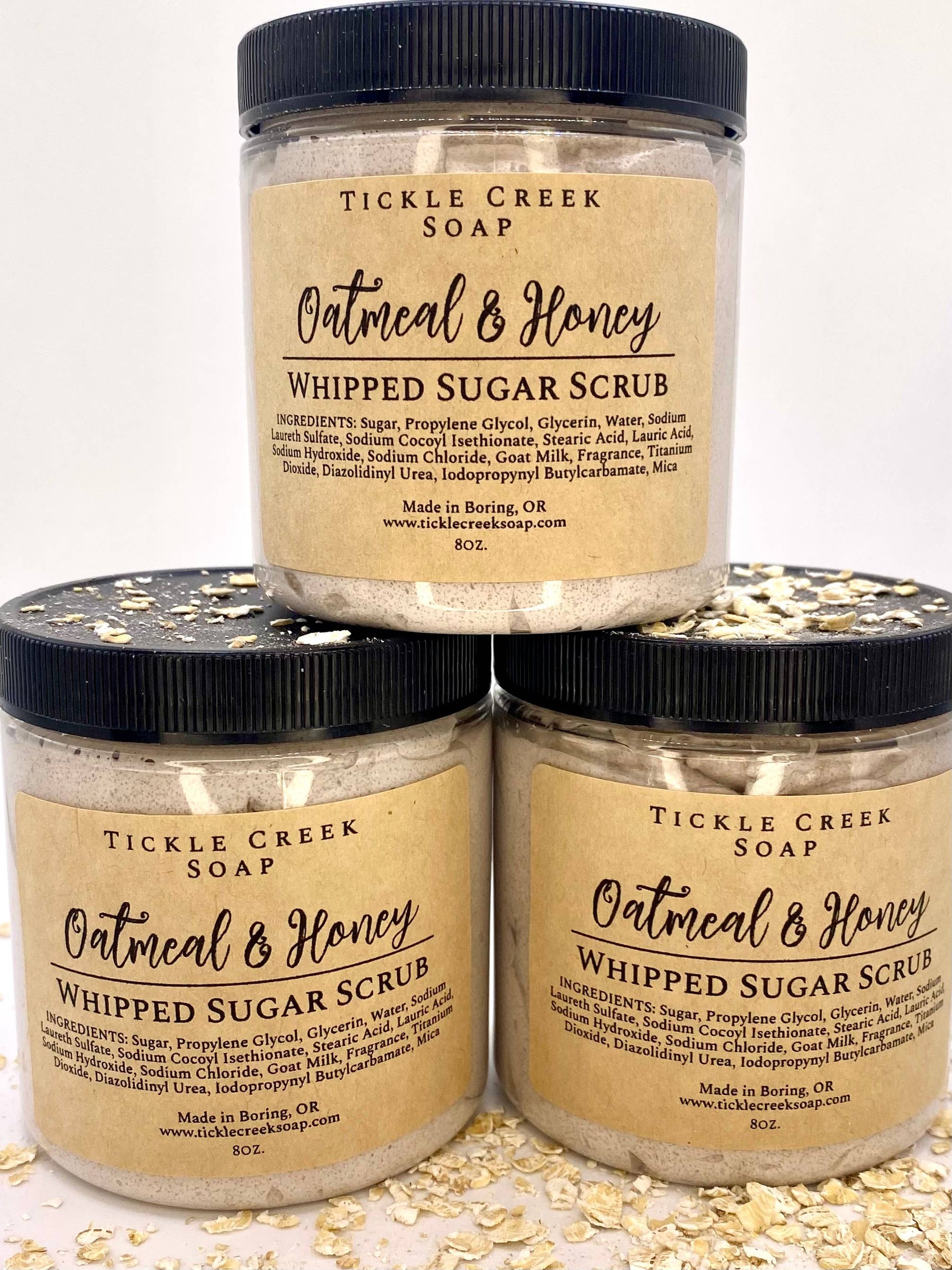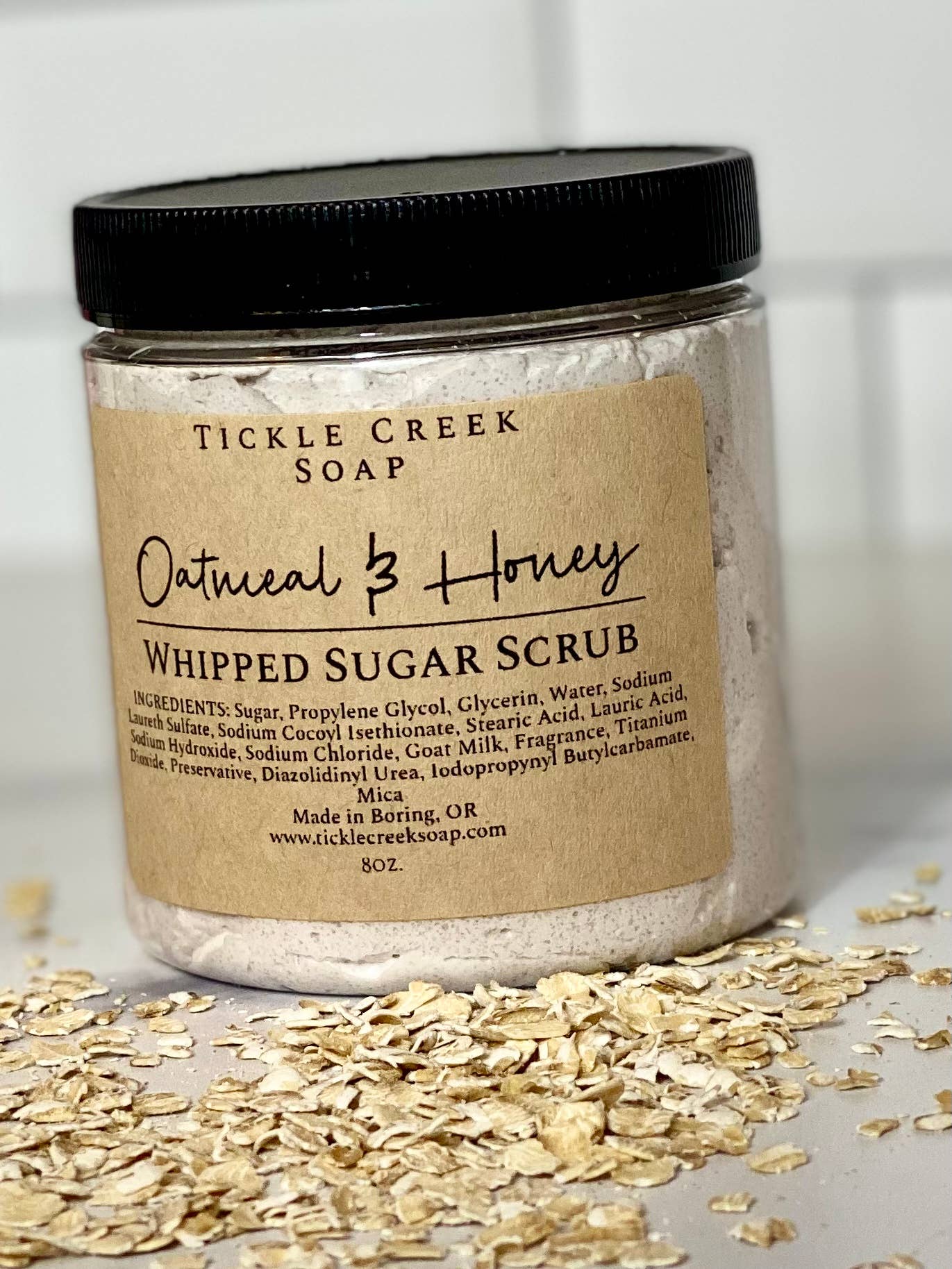 This whipped sugar scrub soap in Oatmeal & Honey will exfoliate, cleanse, and moisturize all at the same time! It smells of warm oatmeal combined with sweet milk and base notes of honey and vanilla beans.