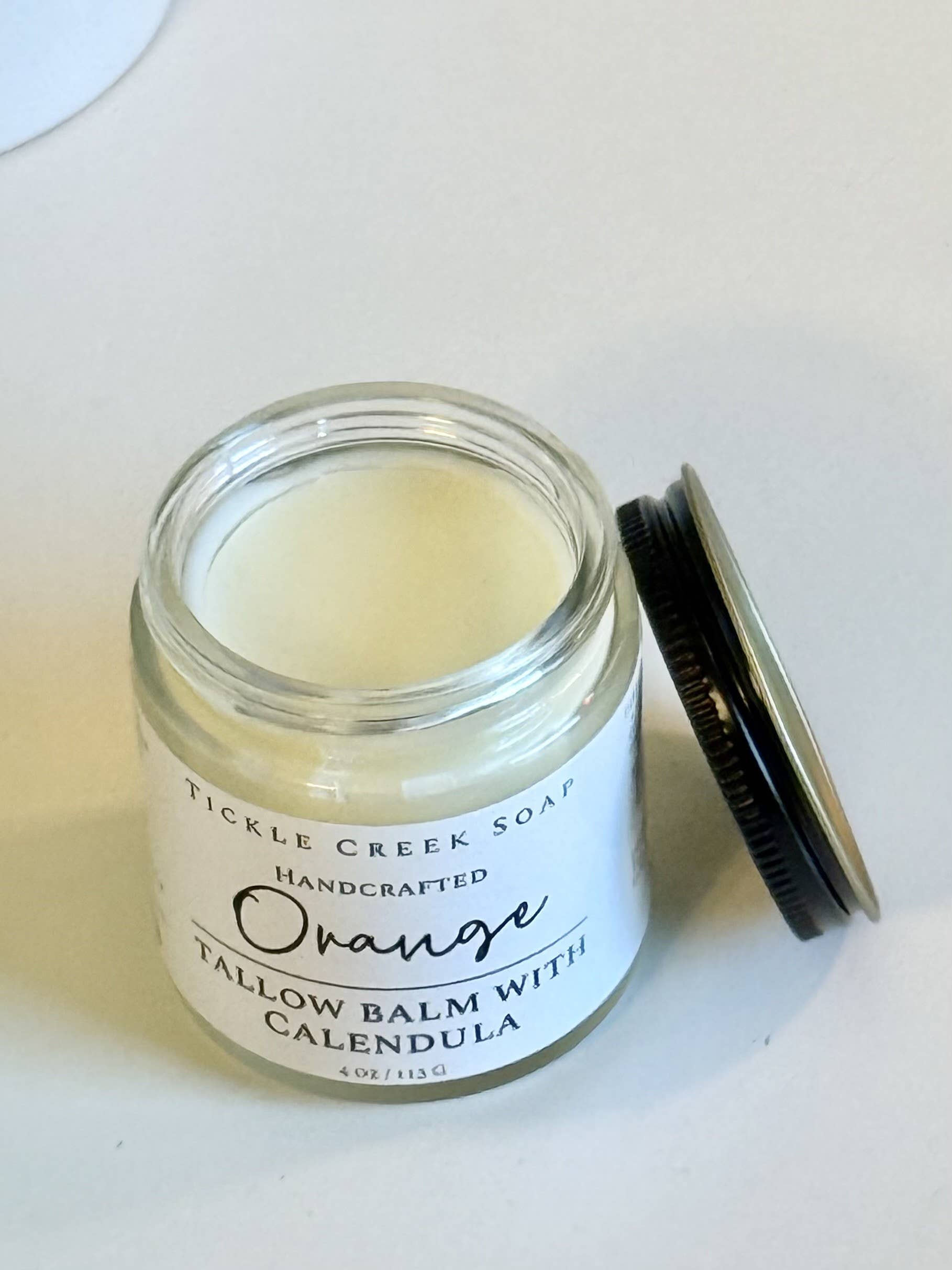 Ingredients: Grass Fed Tallow, Calendula Infused Sweet Almond Oil, Beeswax, Orange Essential Oil.